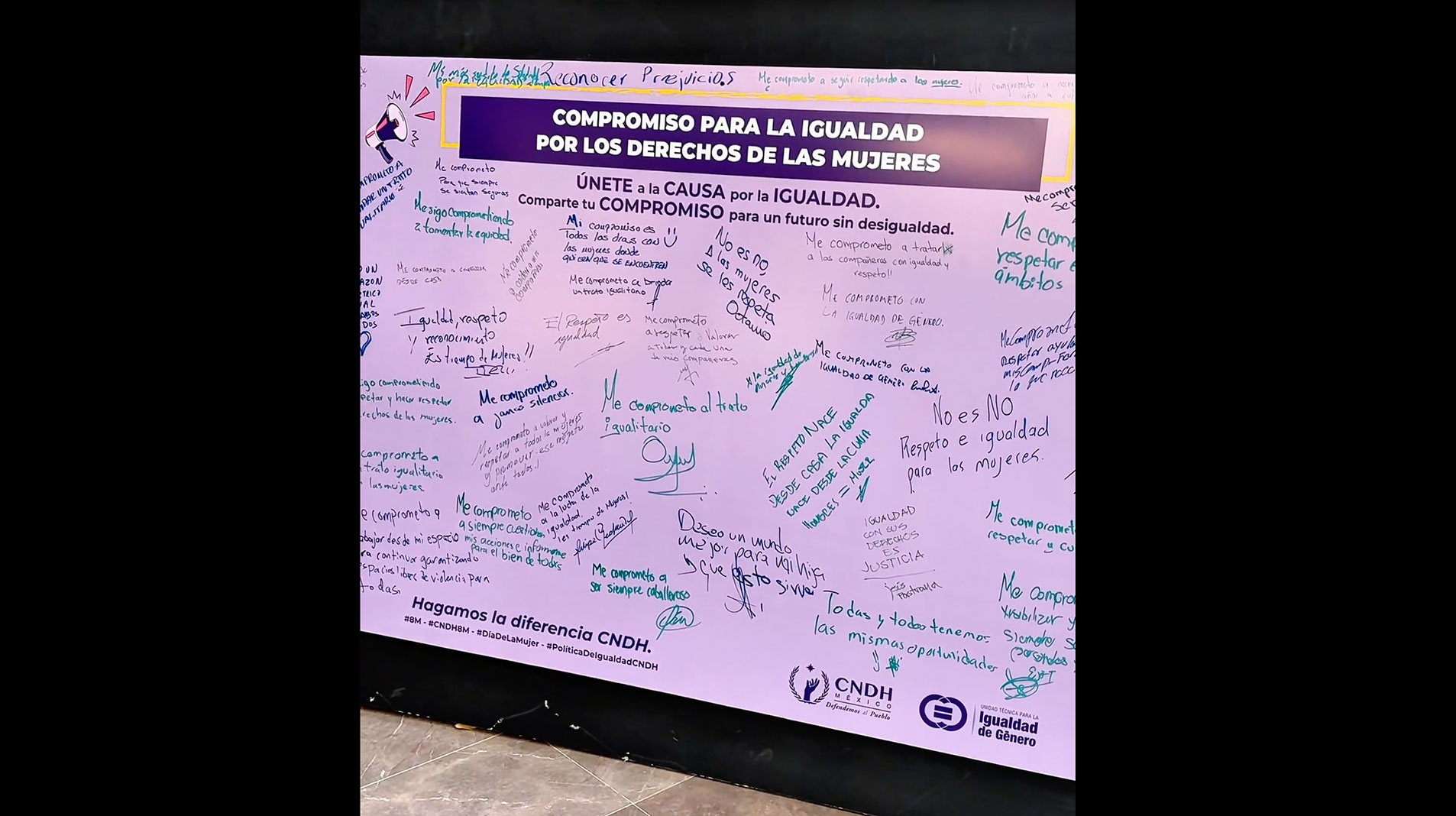 En el marco del 8 de marzo, Día Internacional de la Mujer, un grupo de compañeros de la CNDH firmaron la mampara "Compromisos para la Igualdad: por los Derechos de las Mujeres", un acto simbólico que representó una declaración de voluntad en la lucha por la igualdad de género.